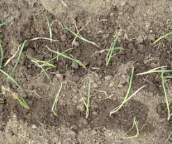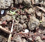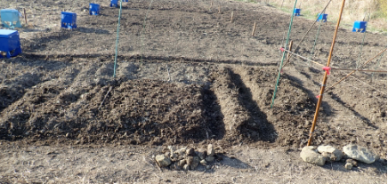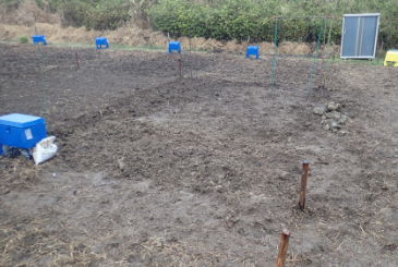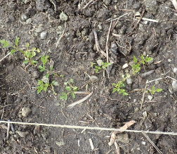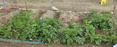 | 3月25日の畑 左からジャガイモ・セリ・小松菜が芽吹いてきた。ジャガイモは6種類種付けしたが双葉位では違いが判らない。セリ・小松菜は自宅野菜の残りだ。 |
