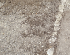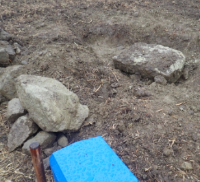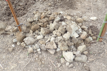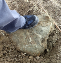 畑の畝作り 2月27日と29日の比較 下の石の写真は左が27日右が29日同じ場所で表面の10cmを掘り進めた時の石と30cm掘ったときの石の数だ、わずか20cm深く、2㎡程度で、この差がある。如何に石が多いかと畑は土作りが実感できる。左下がその畝の途中。左は境界にその石を置いてみた。何となく風流に見えたら思惑通りなのだがさて皆さんの感想はどうだろう。 |