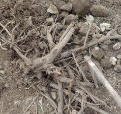 | 畑の現在 2020年4月17日 左から、メイクインの花芽、種付け60日後。 下仁田ネギの苗を植えた。 右は食したセリの根を植えてみた。食用品の長さ40cmにほど遠い。 |