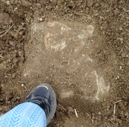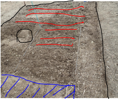 | 第一期開墾終了2020年2月22日 青線部分を開墾。黒丸は石、大きな石(写真右)は24日に事務所が除去。赤線部分に小松菜・三つ葉・セリの家庭用ゴミの根っこ部分を植栽。ジャガイモは全体の4割で残る畑に季節を考え植えたい。第二期は小石など簁にかける。一回収穫の後。 |