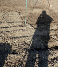 | 初めての農作業 2020年2月16日14:40から16:10 曇り途中から小雨 レンタル農園で小雨の中、ボックスの右側に15個ほどのメークインの種イモを植え肥料を与えた。まだ石・岩が結構ある。(中央写真) 思うほど楽じゃないし土作りが基本だと実感した90分で、明日以降ぼちぼち開墾する。右は全体の姿。明後日に節々がどうなるか心配だが、雨の為2割位を耕して初日終了。深さ30cmは厳しい。 |