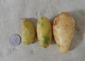 初めての収穫 2020年5月15日 土寄せをした。3個だけ表に出て取れた。左2個は緑に変色している。日光に当たったためだ。毎日世話してたらならないが、自粛していることもあり、タイムリーには作業できない。私が食べるには右の大きさで丁度良い。本格的な収穫の時期を逃さないようにしたい。 |