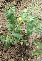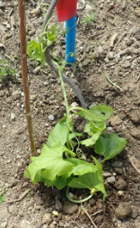 | 今日の植付け 右から順に、種からのミニトマト(2ヶ月前に蒔いた)、 ミドルトマト、中くらいのトマト、ゴーヤである。もっと苗を植えたいが時期をずらしながら植え付けたい。 |