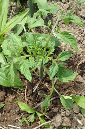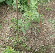 | 地上の野菜6月16日 トマトとナスの実がそれなりの大きさに育った。ジャガイモと違い地上になるとなんか苦労して作った感が強い。地下だと掘出すまで判らないので楽しい自己満足がある。自慢は地上か。 |