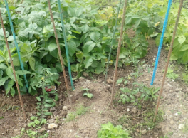 ピラミッド型支柱とあんどん型支柱2個はトマト、きゅうり、ピーマン にゴーヤ、境界付近にセリ・ミツバ、自然に蓬、彩りヤマユリ、カサブランカとカスミソウ |
