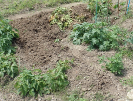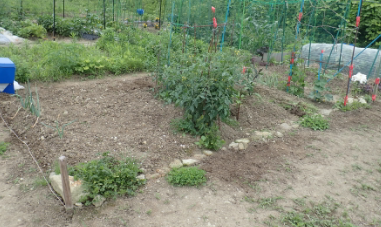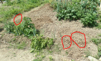 | 6月5日の畑:赤丸の3本の男爵を掘出した。一番最初に植えたが早いモノもあるが成長に差がある。今花が咲いているモノもあるが大きなイモが掘出せた。隣は芹にトマトはまだ青い。 | |