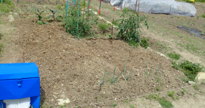 | 2020年6月8日の畑 ジャガイモの次はトマトと下仁田ネギの出番だ。50株植付けたが、40株位が育っている。結構成長に差があるのは地下の栄養の差なのだろうか。陽は平等に差しているし水の同じと思うが。 |