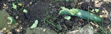 | 畑のキュウリがこの有様。多分鳥ではないか。収穫日を違えてはいけないことを肝に命ず。6/29 13:30 |