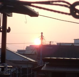 令和2(2020)年6月9日5時4分の日の出 自宅2階から拝む日の出。丁度隣家の間から陽が昇る。肉眼だと真っ赤な太陽で夏至の時はもう少し左だが、起きる自信がないので、この瞬間を記録しておく。午前5時なんて余程じゃないと起きない。来年は腕を上げ真っ赤な太陽を収めたい。夏至の時の日の出を見たことがない。丁度20年だからな。なんとか頑張る。 |