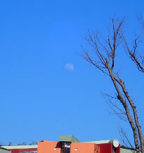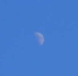 上弦の月 3月6日 バス停「湘南国際村馬門沢調整池」から東の空に出ていた。こころなしか、田浦のバス停「池ノ谷戸」から見るのよりも大きい気がする。厳密にはこちらが高台だからというより、そんな微妙なことではなく開放感がそう感じさせるのかも知れない。この辺では一番の高台で遮るものはない。見上げるほどの山も無い。360度青空でビル群がないこともある。都会とは違う郊外の住宅地で色とりどりの住宅が個性豊かな建物が目を楽しませてくれている。 |