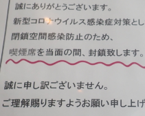 喫煙室の封鎖? 言葉として、封鎖より閉鎖ではないかな。突っ込むことではないが違和感がある。良く行くカフェの貼紙で今どき当たり前なのだが、これを機に一斉に禁煙出来るんじゃないか。愛煙家も仕方なく納得する気もする。8割の店が禁煙にしたら残る2割に客は最初のうちは行くが時間が経つと行かなくなると思う。 |