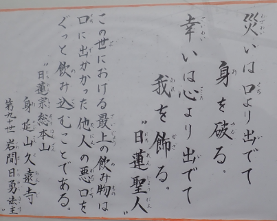 日蓮宗の教え 近所の日蓮宗の寺の貼紙。正月だけなのだろうが、当たり前のことが当たり前で無くなっている昨今、噛みしめて読んで帰依とまで行かなくても親しんで欲しいという思いが滲む。大晦日も一晩中読経が聞こえる。初詣の往復常に声明が新鮮に心に響く。出掛かった愚痴をぐっと飲み込む術がまだまだ足りない。反省と悔恨の入り交じる教えだ。 |