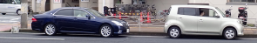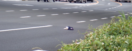 | 汐入の交差点 横須賀でも一番交通量の多いところ。16号線上りのバス路線に入る車道に何やらモノが置かれてる。通る車が皆避ける。車線を変更して行きすぎてから戻したり、慌てて避けていた。恐くて誰も取り除かない。落とし物だろうか。6月10日15:20頃 |
