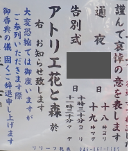 最近の葬式事情 横須賀では家族葬が主流になっているという。知合いの葬儀屋が嘆いていた。昔のように派手とはいわないが、お金を掛けた葬儀はほとんどないそうだ。そして、左記のように「ご香典の儀 お断り」が多くなるかも知れない。この葬儀には参列した。わたしより少し若い方で、ご主人もよく知っている。密葬するには知人も多いが派手にはしたくない。結果だろう。記帳しただけだが、助六寿司折詰弁当と甘納豆に会葬御礼状はお持ち帰りになっていた。 |