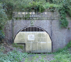 | 田浦の水道道路 「盛福寺管路ずい道」で田浦と逗子・沼間を結ぶ。このトンネルを抜けると沼間になる。水道局の管理で今は一般人は入れない。子供の頃60年前は行き来をしていた。無論正式な道ではないし管理責任なんて言葉がなかった時代の話だ。 |