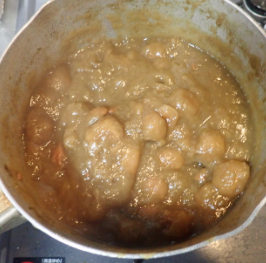 梅ジャムを作る 2020年5月4日 梅酒から取り出した梅は、そのまま食べるのだが時間もあるのでジャムにする。15年漬け込んだ地元で採れた梅で色・形が崩れてないので固い。そのまま鍋でグツグツと種だけになるまで煮込む。なので煮込んだ途中で止めて1時間置いて実を柔らかくする。写真のように実の表面の皮と一部が溶け出した状態で、この後1時間煮込んで完成となる。アルコール分はほぼ飛んでいるが、多少は残っているのでアレルギーの方には無理である。 |