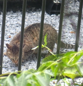 お邪魔猫 野良猫で名前は知らない。柵の向こう側に敷き詰めた小石に糞を撒き散らす近所で嫌われている野良猫だ。警戒心が強くカメラを向けて近づくと逃げる。これは自宅からガラス戸を開けずにそっとカーテンを開けながら撮った。気づかれて逃げたが糞をする動作をしていた。隣も迷惑だが匂うので庭作業のとき甚だ気分が良くない。何とかしたいと常々思っている。 |