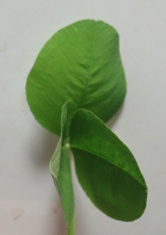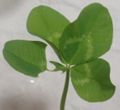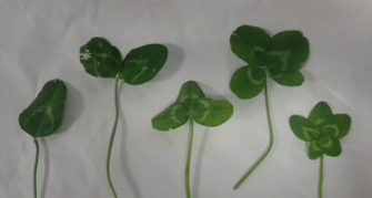 | 1枚葉のクローバー?! 3枚発見した。場所は固まっており、2枚葉と同じ場所。虫に食われて無いのとは異なる。人為的な加工は認められない。専門家に確認してもらう為に押葉にして保存する。 |