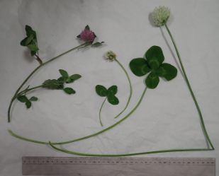 巨大なシロツメクサとアカツメクサ 2020.04.08 普通、アカツメクサの方が大きい。中央のシロツメクサが標準で、右の巨大なツメクサは田浦の谷合いに自生していた。長さ670mmで標準の4倍長い。花も直径40mmで倍近い。体積だと丁度4倍になる。アカツメクサだと花の体積が2倍である。母数が1で評価はできない。目視で標準的だと思うのを選んだので科学的ではない。環境に適合したのだと思うが、きっかけは巨大な四つ葉を発見したことである。このあとも四つ葉2葉と五つ葉1葉を見つけた。形も良いので押葉にした。 |