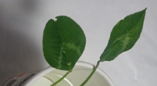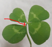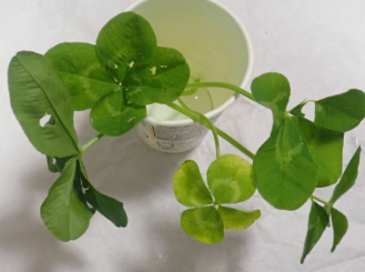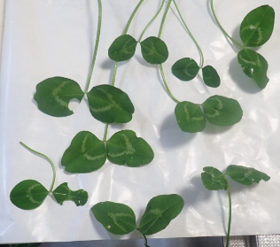 | シロツメクサの突然変異 普通、光合成するので葉は緑色だが、左のように白い斑入りが多い。この場所は谷戸の日照時間の少ない場所。花・葉とも大きく茎の長い。そこに斑のない葉があった。四つ葉より確率は低い。夜になると葉が閉じている。要素は満たしている。 |