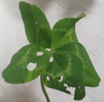| 四つ葉のクローバー(シロツメクサ) 左端は3週前に採取。もう黄ばんできた。虫食いが無く形もきれい。右側の4枚は、順に四つ葉・四つ葉・五つ葉・五つ葉で3本は虫に食されてる。この3週間で昆虫の活動が活発になってきたことが判る。通常の3枚葉より食される。3週前にはきれいな4枚葉・5枚葉を採取して標本にし押葉にしている。「幸せを呼ぶ」ということでプレゼントするのが習慣になっている。ただ、時間の経過で緑が変色するので色落ちしない方法を開発中。乞うご期待。ちなみに花言葉は日本では「希望」「進行」「愛情」の印で残る一枚は「幸福」のシンボル。五つ葉の最後の一枚は「財運」だそうです。これらは人にあげることで自分も得られると言われています。だから見つけたら積極的にあげル事にしています。 |