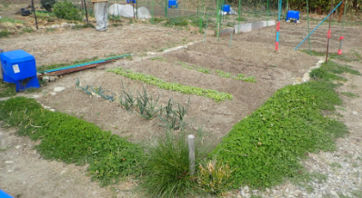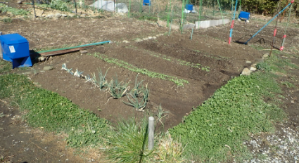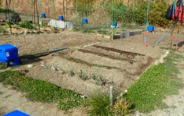 | 1月26日の畑 両端のネギ・玉ネギ・ニンニクはあるが、一年で高々4坪の畑を開墾した。5つの畝に何かしら植える体制が整った。本当はもっと深く掘り石を除いて土作りをしたかったが肉体が許さない。満足はしている。これから、大根・ジャガイモを植え、脇でセリなどを植えて愉しみたい。 |