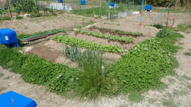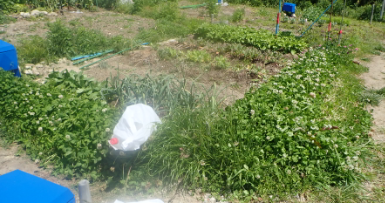 収穫し終えた畑6/9 支柱がなくなり、シートを広げて荷物を置き、収穫した野菜を袋に詰めておく。最後に水遣りで全て使い切った。 |