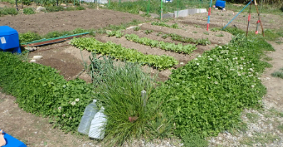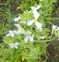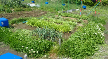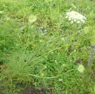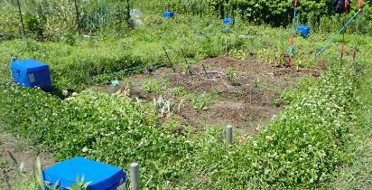 | 6月6日の畑(下) 右は巨大化したニンジンの花とハダイコンの花 |