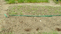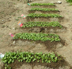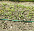 後方は畝作り、水遣り、前方右は、平地にばら蒔き 発芽から全て、畝水遣りの方が早い。時期が1ヶ月早いと発芽も遅く、水遣りもだが、気温(地熱)や陽射しによる違いと思われる。自然は多少の天候差はあってもサイクルは代えられない。 |