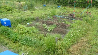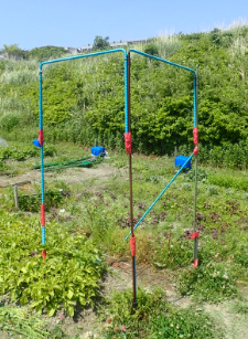 支柱を解体した畑 あと7日間、雨と陽射し除けとして機能していたが作業を考え、解体した。紐で縛って車に積むだけの状態にした。 |