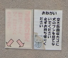 | 湘南国際村のテニスコート5/26 市営のテニスコートの自動販売機の空き缶入れの注意書き。ここは犬の散歩コースになっているが、心ない飼い主がいるのだろう。ゴミ箱がわりに廃棄物を棄てる人が居ると云うことなのだろう。飼い主も人が居ると始末するのに早朝・夕方の管理者や利用客がいなくなると出来心がそうさせるのだろう。 |