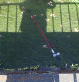 バス停前の側溝に落ちた杖 私もここに落としたことがある。深さ1m位で、写真のように水がほとんどない。 靴のまま降りて拾い上げ、バスには間に合った。この人は助ける人もいなくてバスを優先したのだろうか。なんとなく不安で持つ人は多い。忘れ物が多いのも頷ける。 |