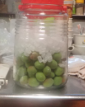 | 4/27&28と2㎏を漬け込む 去年から梅ジュースにした。それ以前は梅酒だったが、毎年作っても溜まる一方で20年物が結構あるが、自宅で酒を飲まないのでやめた。ジュースなら夏場の健康に良いので昨年は重宝した。 |