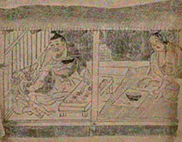 縁起絵巻の話を膨らませると、 娘が捧げた袴と下げ鞘が合体して、袋になり江戸末期の御代に刀に変えて、箸と箸紙になったのではないかと推測している。 大胆な仮説を考えると、箸墓の百襲姫の伝承と正倉院の刀子と鞘が合体して錦絵になったのではないか。(錦絵は国立国会図書館のデジタル化資料より)