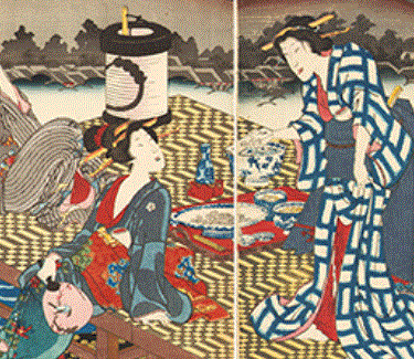 出典:豊国三代四条河原(部分) 以下7枚の写真・文章は、『錦絵が語る江戸の食』松下幸子、遊子館、2009、 の孫引きと出典からの転載である。
