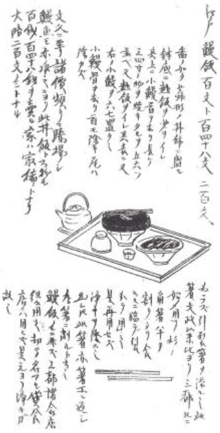 『守貞謾稿』(1853)の該当ページの写しだが、「必ず引裂箸を添ふる也。この箸文政以来ころより三都ともに始め用ふ」とあり、 鰻飯以外の食べ物屋でもこれを使うが、名のある店は使わないとある。台屋が運んでくる台の物に添えられた箸は塗箸だろうと思われる。