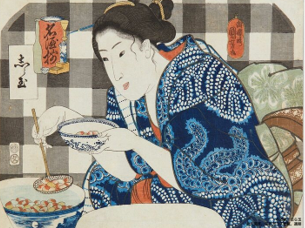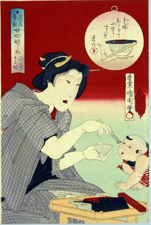 左は二本の箸で、とろろ汁や料理を取り分けている図で上記の女性とは異なる。またとろろ汁を箸で食べるように、匙は一般的でなくなっているのかも知れない。 豊原國周・見立昼夜二十四時之内正午十二時