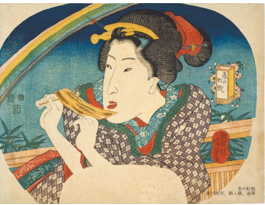 若い女郎屋の遊女が、カラッと揚がった海老天を箸で突き刺して、いざ一息に食べようかという決定的瞬間を描いた作品。「むまさう」というのは、言うまでもなく「うまそう」という意味です。なんとも言えない弛緩した表情。客には魅せられない。口元を拭っているのは、無意識によだれが垂れるのを防いでいるからでしょうか。