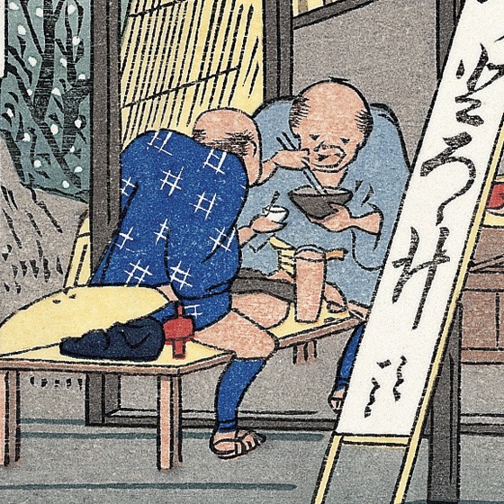 広重や豊国の版画にみられる宴会風景にはしばしば箸が登場している。本物の絵を手に取って子細に調査できれば、 箸袋らしきものがあるかは認識できるかもしれない。箸と煙管の区別すらネット図版では判別しかねる。