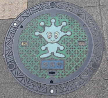 市役所8階に展示されていた。救急医療センターの隣の歩道に同じマンホールが使用されているという。マンホールカードを頂いたら宣伝された。共によく見かけるマンホールで結構市内にある。水道局のシンボル”アクアン”がマークだ。 |