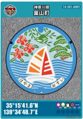 ヨット・ツツジ・黒松・鶯をデザインした 葉山のマンホールカード |