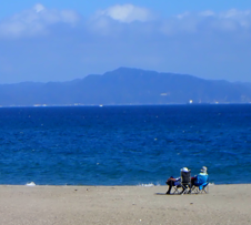 | 10月11日(月) 快晴 三浦海岸に行った。「もう秋、誰もいない海」を見に行ったわけじゃないが、カップルが結構車できて椅子を出して陽を浴びていた。パラセーリングをしている人もいた。のんびりと気だるい昼下がりをに砂浜を踏んだ。 秋の日を 浴びて遥かな 山波を 砂を踏みつつ 波間に眺む カードなく うら悲しきや 秋の日は 焼け付く陽射し 心慰む 波白く 穏やかに寄す 秋うらら パラセル舞う 青天を突き 東風吹かば 青天を抜け 陽は高く 砂浜に座し 愛を語らう |