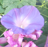 ムクゲの木に絡まった朝顔。 同時に咲いている。 |