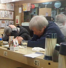 | 12月6日(月) 曇 今朝はゴミ出ししないと思うと朝寝してしまう。もう冬なので気は緩んでいるがそれでも生ごみは溜めない。特に夏は匂うのでいけない。元々ゴミは少ないがそれでも溜めてしまう。特に紙類は仕方ないじゃ済まないくらいに溜める。 遅い朝は、トーストに味噌汁。昼は雑煮に一昨日買ったネギを茹でてあったので入れた。一昨日、Iでネギと鮪のすまし汁を頂き、真似してみたが、難しい。 光頭の カウンタ並ぶ 居酒屋で 静かに流る 霧の摩周湖 居酒屋の 定番メニュー 煮込みなり 肉なし頼む 客は太目や 亭主奥 女房カウンタ 居酒屋は いつも笑いの 列待ちなるか 業者かな コソッと入る トイレなり 客の視線を 気にしつつ出る スパッツの 足は素敵な 彼女だが 上体でかく 興覚めなりや |