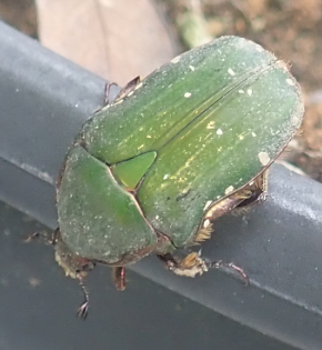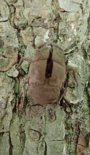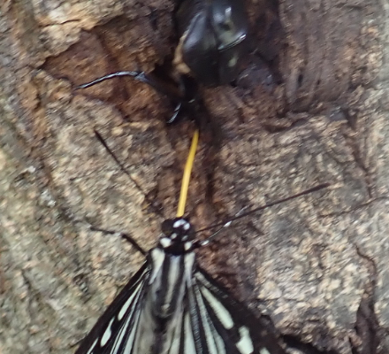 | 水歩の帰りに見ると、アゲハが口吻を丸め、カナブンの下から覗いている。 | 足でアゲハを追い払い(+カメラを感じたか)樹液を独り占め、だがアリが徘徊している。 | ウエルシティ公園のクヌギの樹液にカナブンが頭を入れ、アゲハが横から口吻を出している。 | |