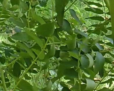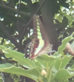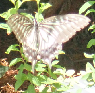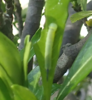 | モンキアゲハの幼虫は姿を見かけなくなった。燕などの餌になったか定かではない。遅咲きの花が咲いていた。 | 別角度から撮ったが、これ以上は拡大無理。 | ベランダからクロガネモチの葉にいた。 | |