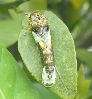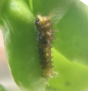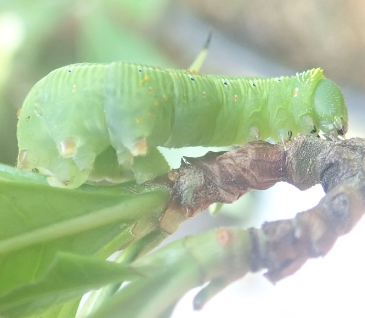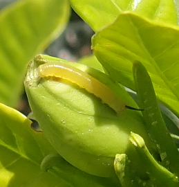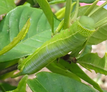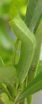 | ウエルシティの公園で昼ご飯中を撮った。花はフリンジラベンダーと同定した。 | ウエルシティの梔子の蕾を貪ってた。右の自宅幼虫と同じくらいの大きさ。 | 自宅のコクチナシの幼虫で、2㎝+になり駆除した。盆栽だが見逃していた。 | |