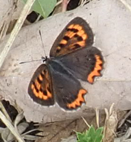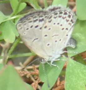 | 小さな桜に似た花が咲く。実は小豆位の赤い実が結構ついている。 | 文様からはルリシジミではないと同定。右同じ | 自宅の片喰の葉にいた。 | |