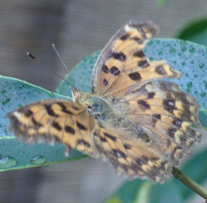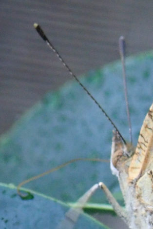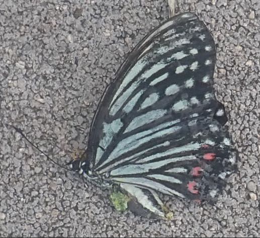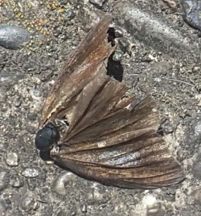 | バス停の側溝にいた。同じ個体だが光の加減で違う色に見える。 | これも自宅前の歩道に死んでいた。自宅のセリ・チドリソウなどを食い荒らした犯人だと思う。 | 自宅前の歩道に止まっていた。羽が相当に痛んでいるし、近づくと元気なく飛んで行った。 | |