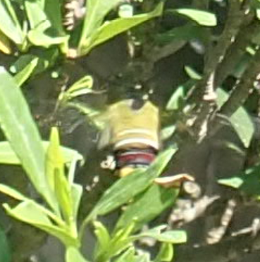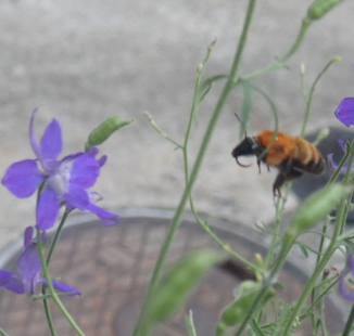 | 自宅のチドリソウの花から花へ蜜を集めていた。次の花への瞬間を撮った。よだれが出ている。 | 自宅植木棚の下に歩いていた。 | 自宅のコクチナシの鉢の淵にいた。卵でも産みつけるのだろうか。 | |